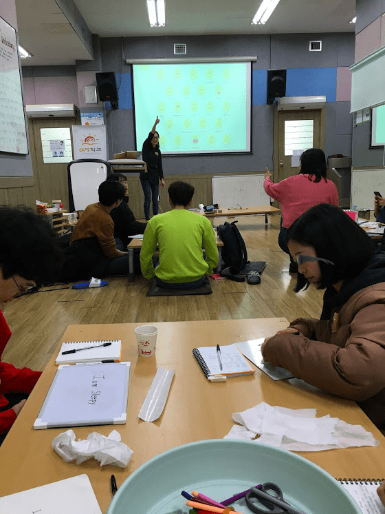 The first half of the day was focused on ice breakers and learning English words, which had mixed results. Some of the students were very into it and were excited to learn words such as “question” and “please,” while other students (especially those who had done the program before, or were not comfortable in either English or Korean) were not as engaged. It’s always hard to gauge the pace when students come from such different levels of familiarity. At least everyone got to learn each other’s names! Sarah really helped out with the Korean (this really surprised the students), Lulu’s Chinese came in clutch when explaining to the students who were Chinese speakers, and Lexi was always there to reach out to students and help make things happen.